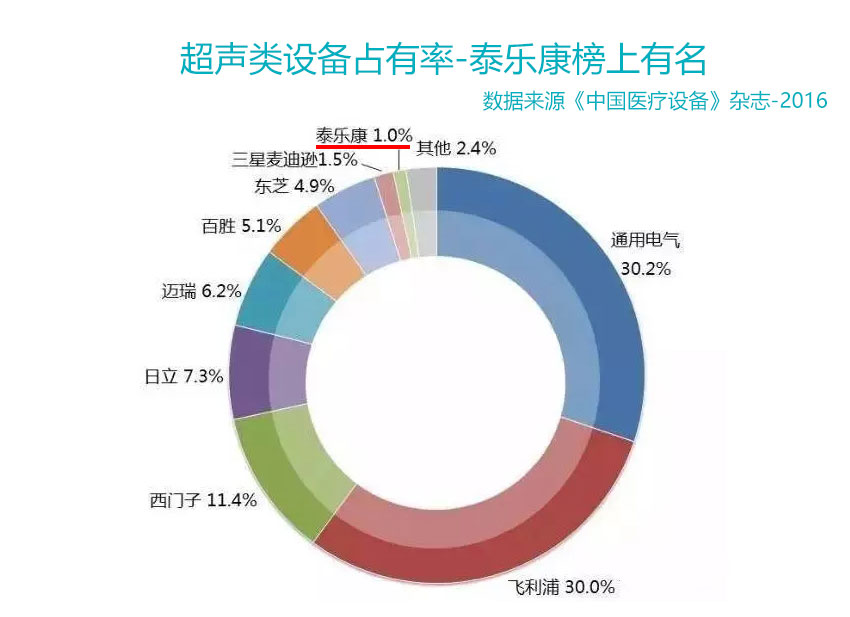 中國(guó)醫(yī)療行業(yè)權(quán)威雜志《中國(guó)醫(yī)療設(shè)備》發(fā)布了醫(yī)療行業(yè)大數(shù)據(jù),里面列舉了21類醫(yī)學(xué)設(shè)備各品牌占有率。在超聲類設(shè)備數(shù)據(jù)中,泰樂康非常榮幸以1%的占有率榜上有名。在醫(yī)療巨頭林立的超聲行業(yè)里,我們深知這看似很少的1%占有率來(lái)之不易,是經(jīng)過(guò)泰樂康6年多的執(zhí)著、努力、拼搏而來(lái)的。